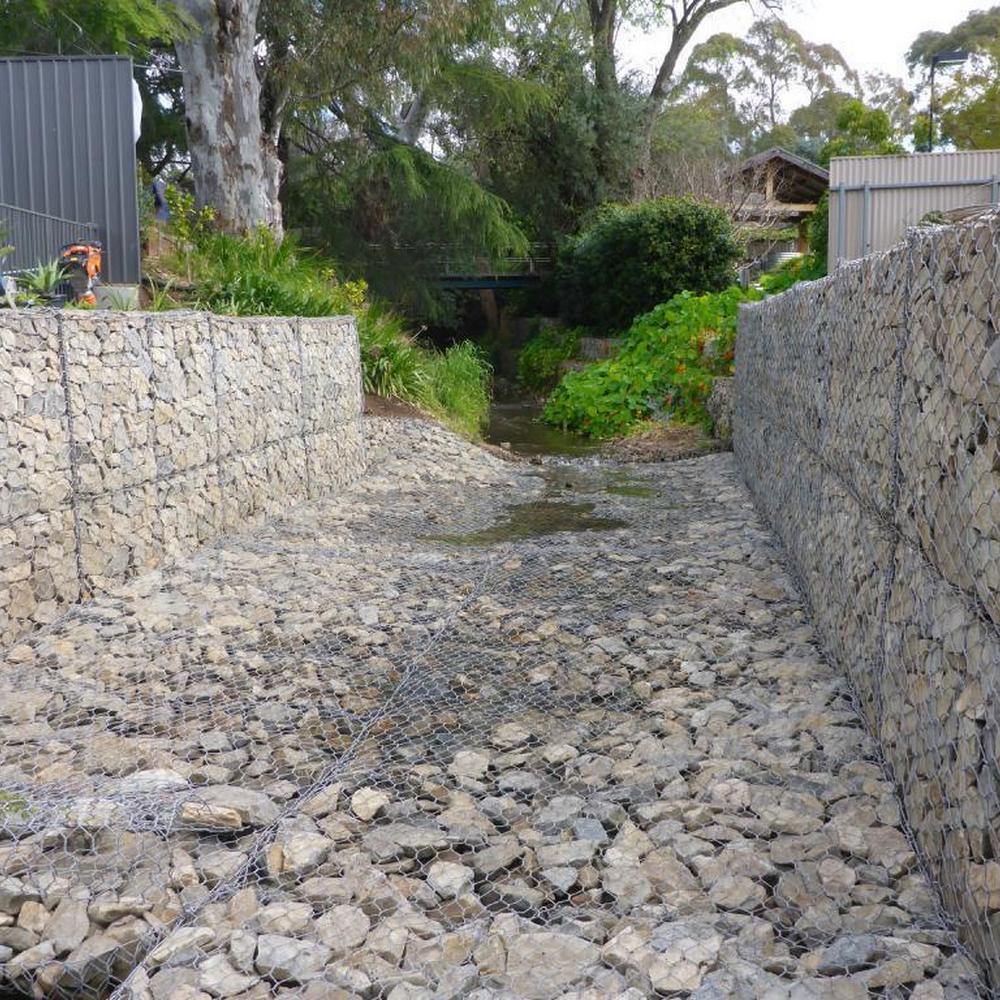雷諾護(hù)墊是厚度在0.17-0.3m的網(wǎng)箱結(jié)構(gòu),在現(xiàn)場用于裝填石頭。主要用作河道、岸坡、路基邊坡防護(hù)結(jié)構(gòu)。既可防止河岸遭水流、風(fēng)浪侵襲而破壞,又實(shí)現(xiàn)了水體與坡下土體間的自然對流交換功能,達(dá)到生態(tài)平衡。坡上植綠可增添景觀、綠化效果。